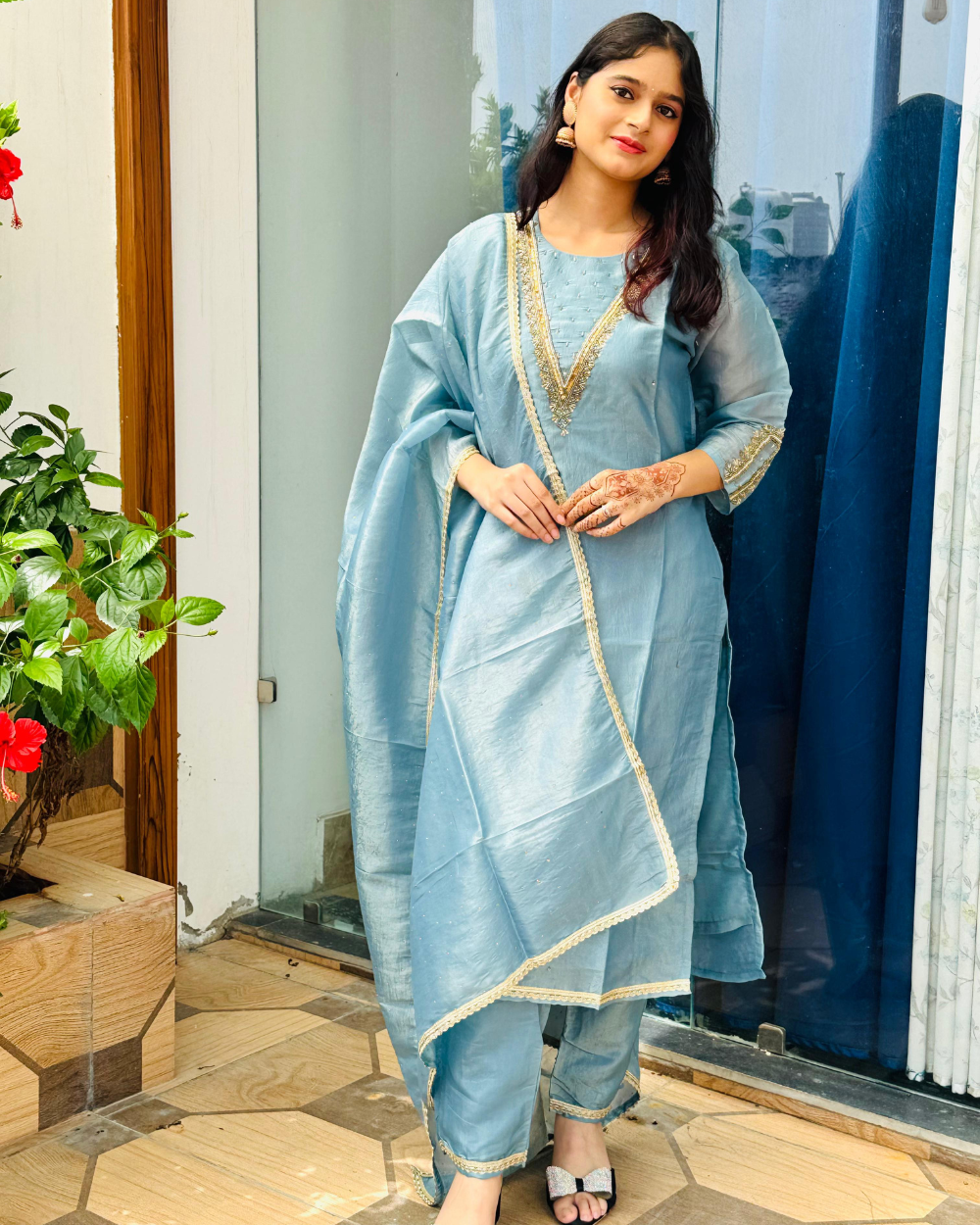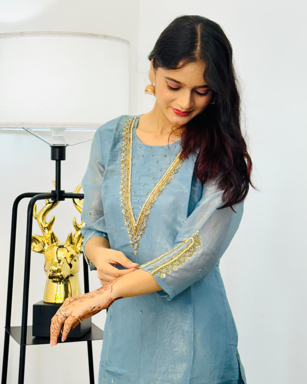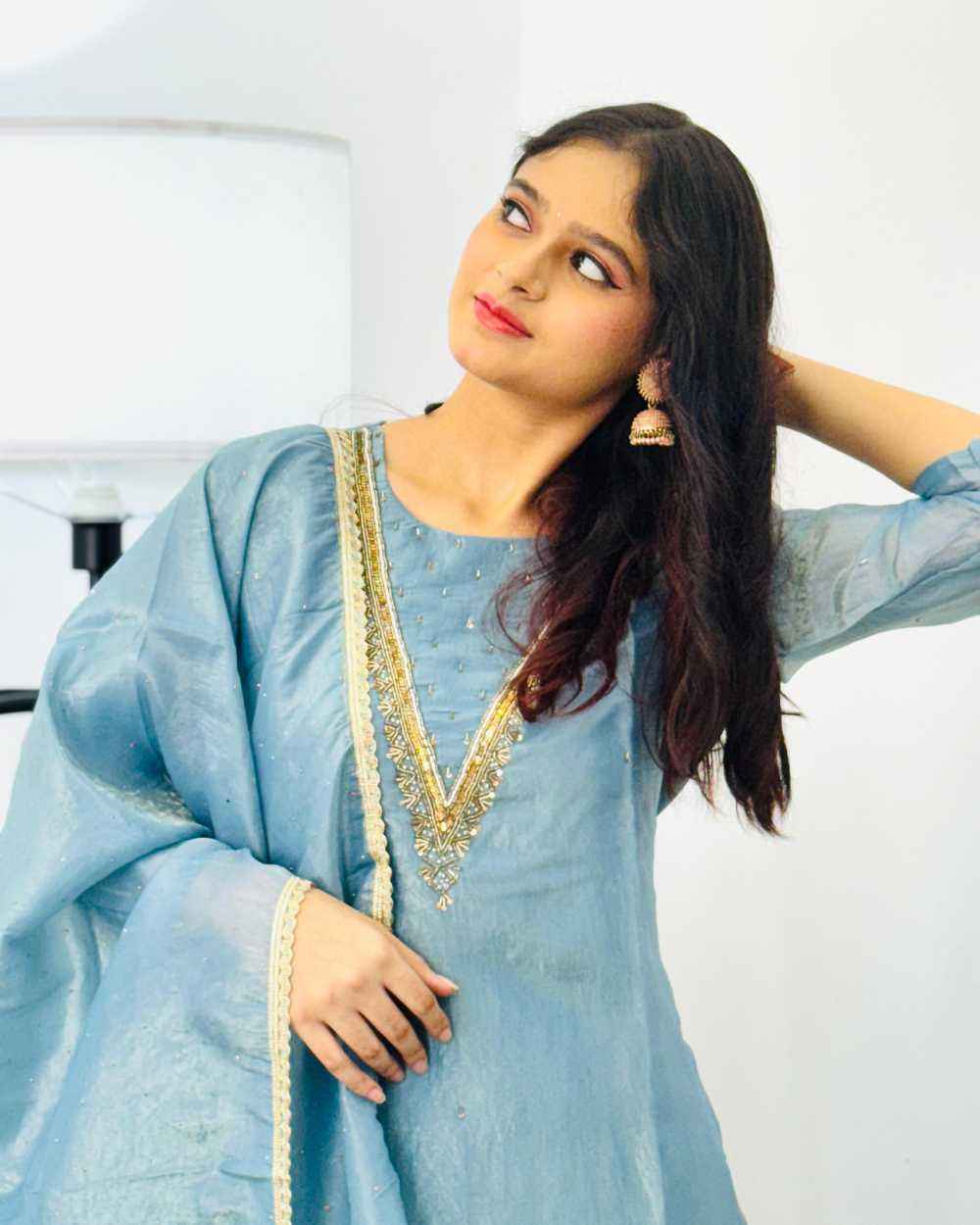 TANRAAYA Blue Silk Kurti Pant set with Embroidery on neck and Gota Patti on Dupatta