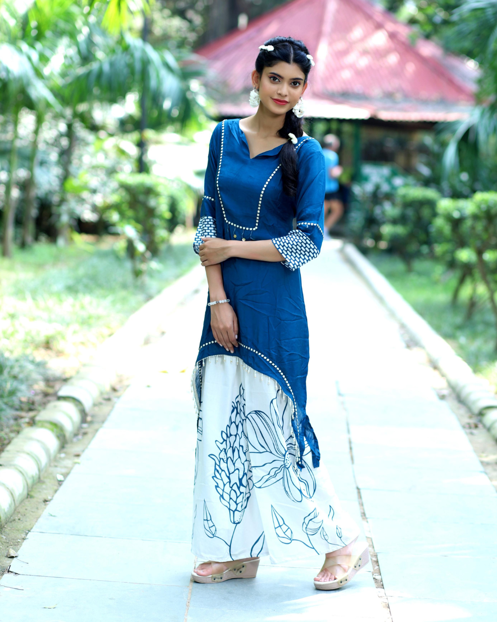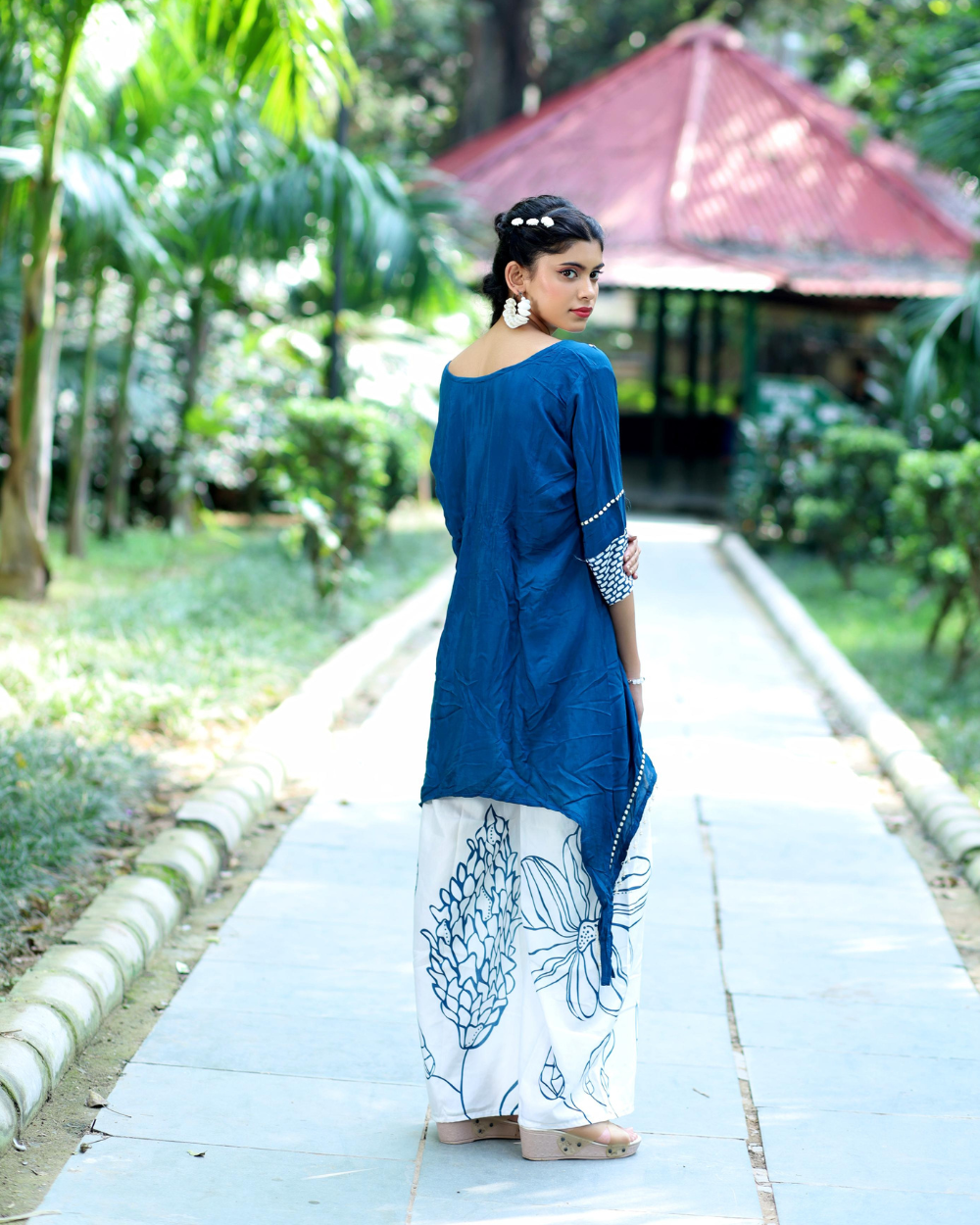 TANRAAYA Cobalt Blue Asymmetric Kurta with Floral Print on Salwar