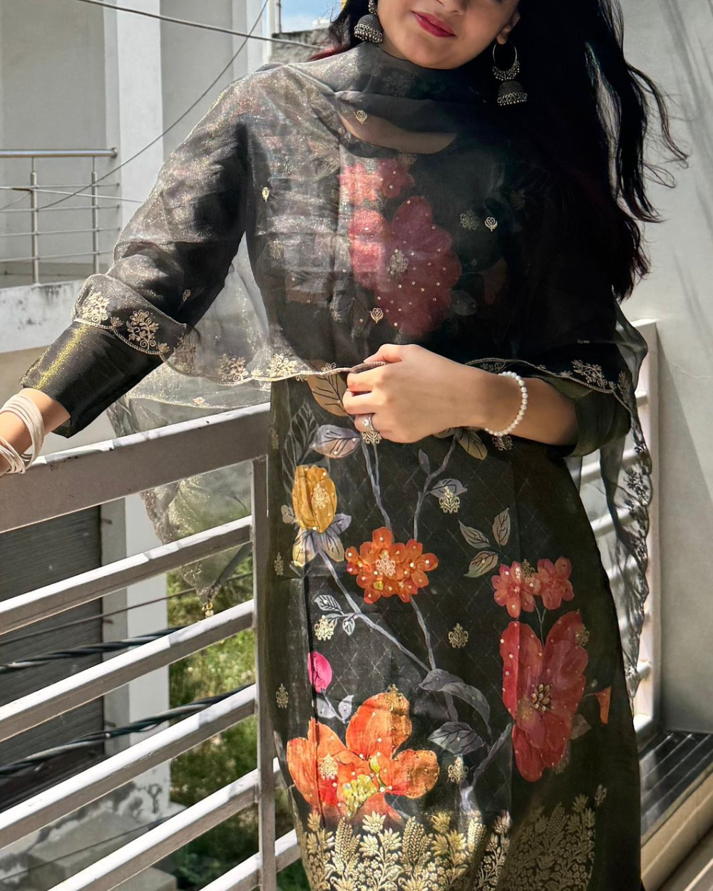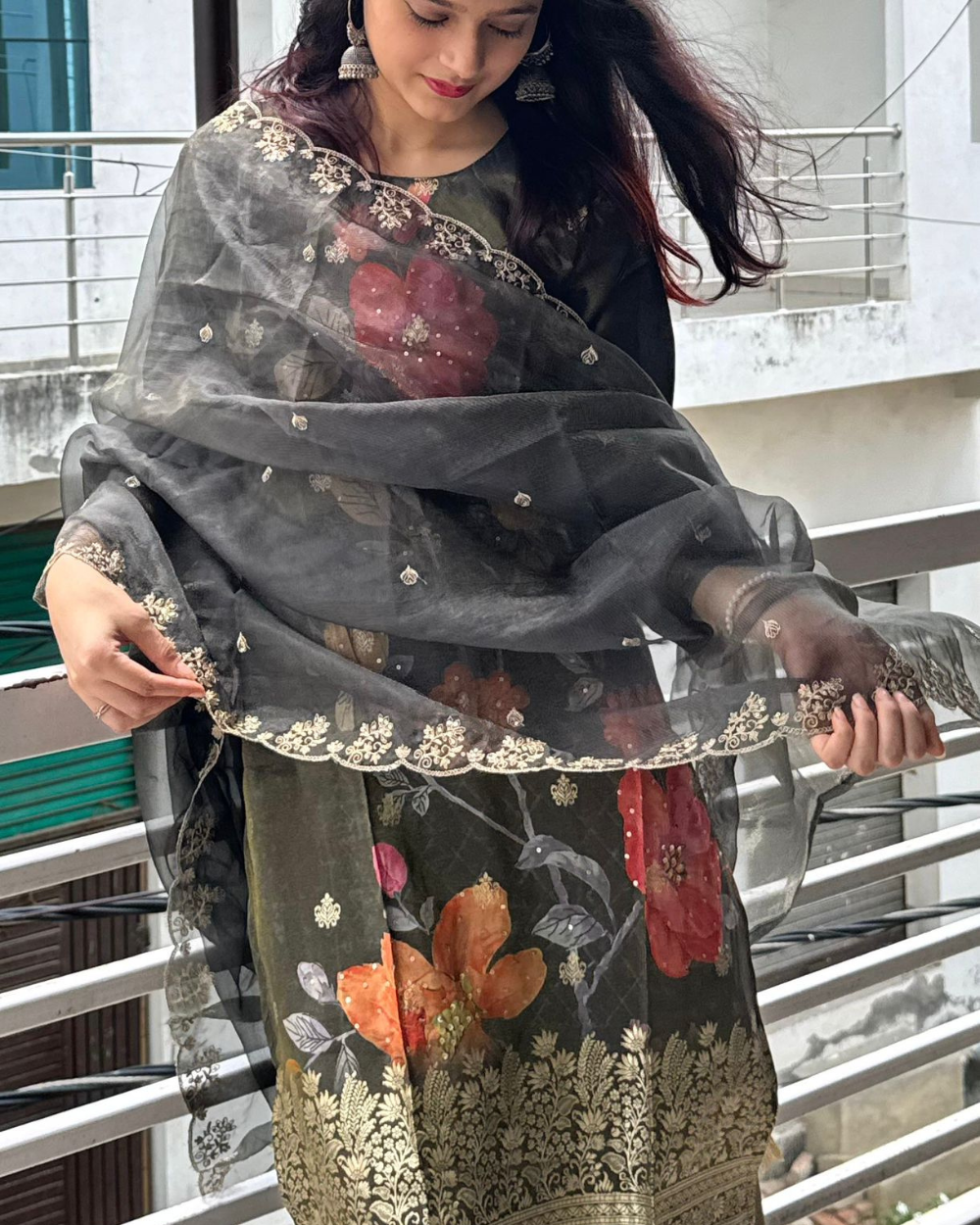 TANRAAYA Mehndi colour with floral print kurta sharara set with organza dupatta
