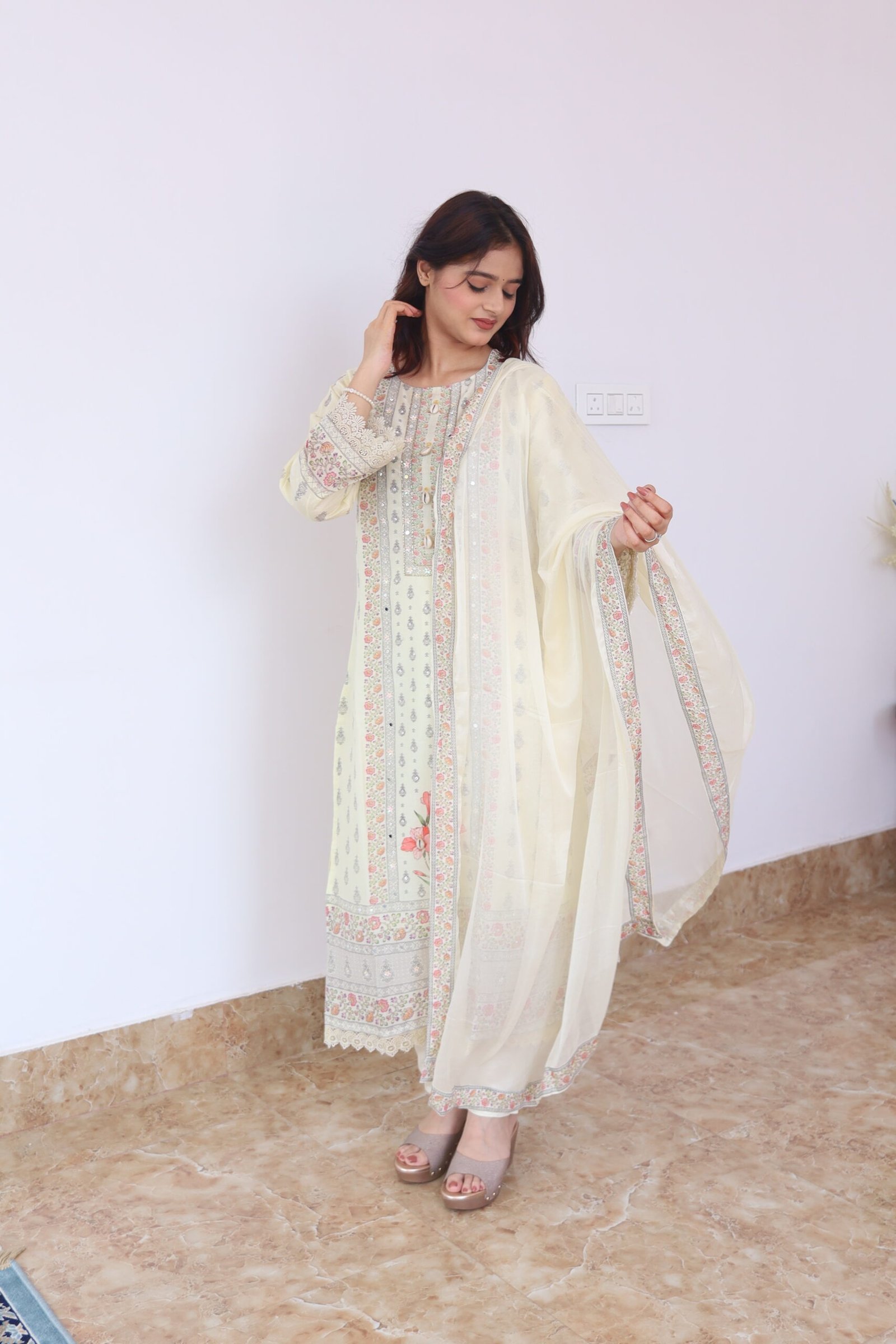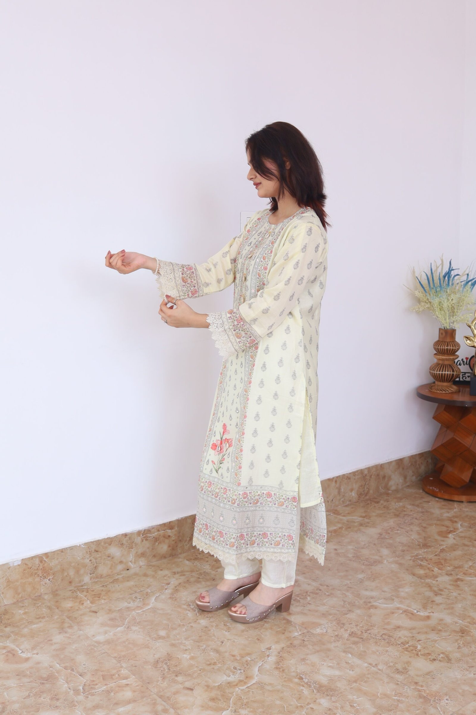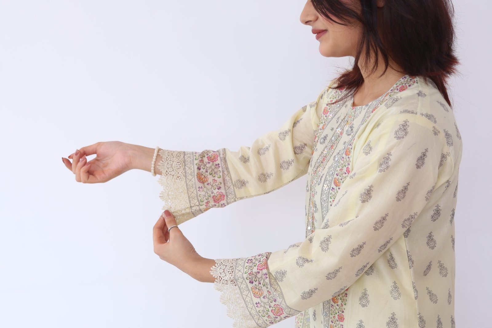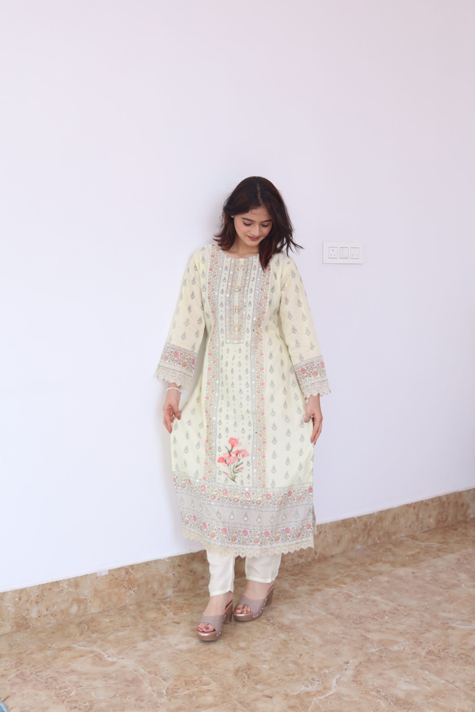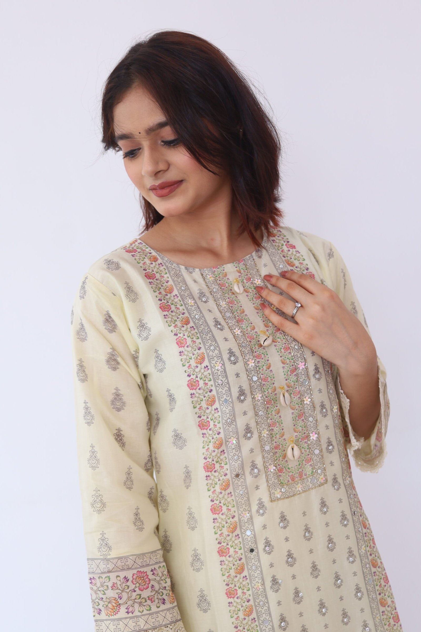 Be the first to review “TANRAAYA Pale Peach Printed Kurta Set with Embroidered Sleeves & Neck”